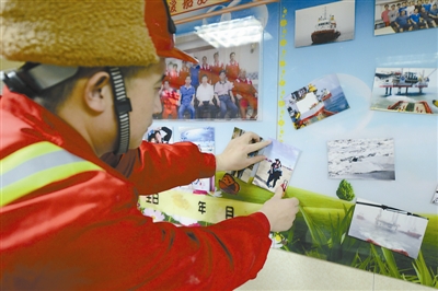 为了缓解海上长时间的寂寞,在井架仓狭窄的通道里, 他们把自己的全家照贴出来共赏。