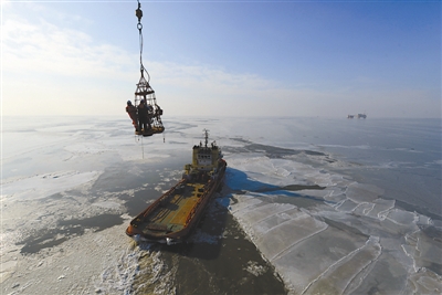 在冰封后的渤海里工作,每一道程序都十分艰难。