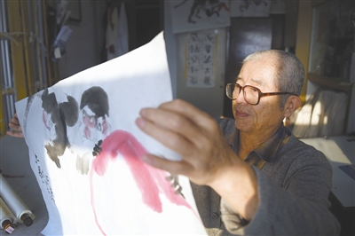 青岛市,画猴名家刘景曾拿起刚画好的画仔细端详,30年来他一共画猴上万幅。志闻 小真/摄