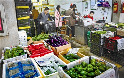 2月16日,工人在深圳海吉星批发市场搬运蔬菜。