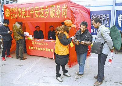 本报讯(记者李丰)春运期间,成都铁路局贵阳火车站联合贵州省总工会在贵阳车站设立“农民工平安返乡服务岗”,为农民工提供职业介绍、法律援助、引导乘车、困难帮扶等服务,并发放《劳动用工宣传手册》,讲解《工伤保险条例》简明实用知识。