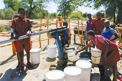 2月15日,在津巴布韦南部马斯温戈省农村,当地孩子放学后在一口地下井前打水。