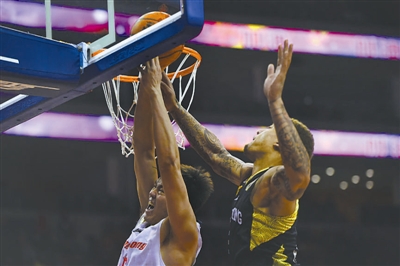 图为广东东莞银行队球员董瀚麟(左)上篮遭遇山东高速队球员比斯利封盖。