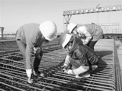为确保2月26日完成局投产鉴定,3月5日通过箱梁部级取证,中铁四局五公司昌赣客专2标丰城东制梁场春节期间组织施工,完成了取证前需试生产的16片箱梁预制任务,同时完善了机具设备、技术管理、质保体系等各类箱梁生产取证的基础准备工作。图为施工人员在绑扎钢筋。