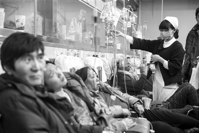 2月19日,北京大学人民医院急症科,25岁的青年护士葛辉正在急诊病房看护病人。春节过后,随着北京市流感患病人数的急增,她平均每天需要看护100多个病人,是平时工作量的5倍。