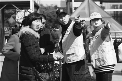 2月17日,江西南昌火车站遭遇返程客流高峰。有着8年应急救援志愿服务工作经历的南昌铁路局向塘机务段职工王坚和他的女儿王橙睿为游客指路。
