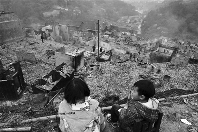 2月21日,贵州剑河,两名小孩在岑松镇温泉村观看已经变成废墟的家园。20日下午5点多,温泉村苗寨发生火灾,200余户民房被毁。火灾最初从村干部家中烧起,引燃村寨。21日凌晨,明火被扑灭。据了解,有人员在火灾中受伤,具体情况仍在统计中。