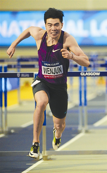 当日,在2016年格拉斯哥田径大奖赛60米栏决赛中,中国选手谢文骏以7秒63的成绩获得冠军。新华社/法新
