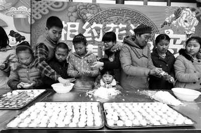 2月22日,重庆市铜梁县南城街道和土桥镇的留守儿童、留守老人和留守妇女在包汤圆。