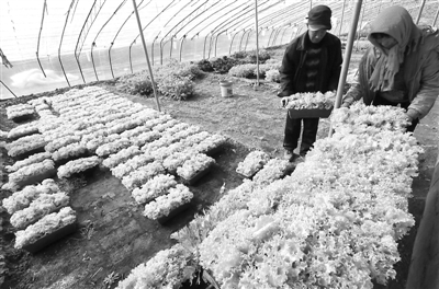 图:2月21日,山东即墨市移风店镇大丰收种植合作社农民在大棚里管理盆栽苦苣菜。