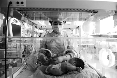 2月22日,在河南省商丘市柘城县人民医院,新生儿病区的护士在给一位婴儿做护理。由于近年来早产儿逐渐增多,医院的暖箱一直处于饱和状态。 新华社发(冯大鹏 摄)