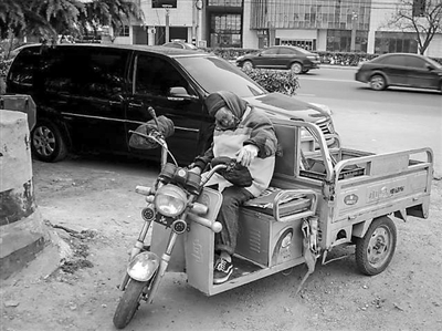 因为太过疲惫,在打扫完地上的纸屑和垃圾后,在最低气温只有零下2摄氏度的寒风中,她睡着了。戴着一顶红线帽,包裹着蓝方巾,穿着环卫服装,她的头发早已斑白。