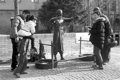 2月9日,北京前门大街,一名小孩在家长的看护下爬上一尊雕塑玩耍。在短短的半个小时内,雕塑里的这个小人已经连“背”八个孩子。有家长打趣道,"这小铜人今天累得够呛"。