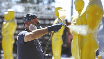 2月24日,在美国洛杉矶好莱坞,一名工作人员在喷涂奥斯卡金人雕像。第88届奥斯卡颁奖典礼将于当地时间2月28日举行。在典礼举办地美国洛杉矶好莱坞杜比剧院,各项准备工作正在紧锣密鼓进行。 新华社记者 杨磊 摄