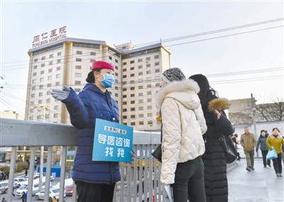 2月26日,北京同仁医院的工作人员走出医院,引导市民就诊,并解答他们的问题。