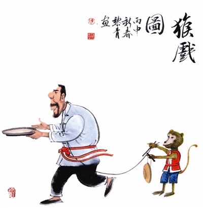 在十二生肖中,最具喜剧天赋者,猴,无疑当“猴”不让。猴年上演猴戏似乎顺理成章,不过,也有顺理不成章的,比如漫画家黎青先生的作品《猴戏图》。