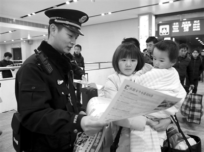 元宵节前后,浙江各大火车站迎来外来务工人员返程高峰,杭州铁路公安处组织青年民警成立宣传小分队,深入杭州各火车站开展铁路安全宣传。图为民警在杭州站出站口向返程务工人员讲解安全知识。