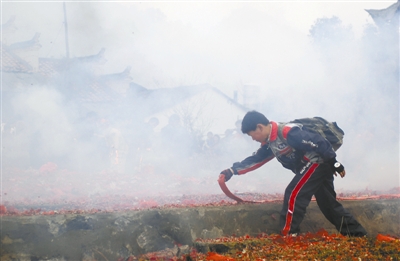 燃放,也从城市走向了农村。在陕西镇安县云盖寺镇,大年夜,震天的鞭炮、烟花响了一整夜,谈家常、看春晚、睡觉都无法进行,乡村本自洁净的空气和院落都明显受到污染。“比城市还厉害,可能是外出打工的都回来了,放炮有比谁家厉害的意思,也有突然闲下来需要打发无聊的意思。”从武汉回老家过年的某杂志社总编辑说。