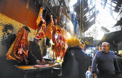 2月27日,在叙利亚首都大马士革,人们走过一处农贸市场。