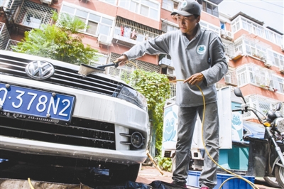 一名“互联网+”洗车工,正在北京市一家小区为客户洗车。本报记者 王伟伟 摄