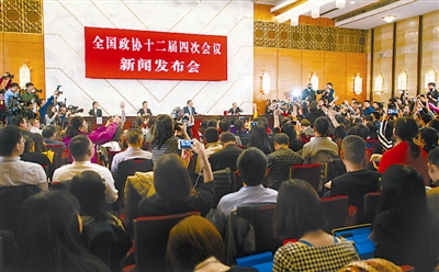 3月2日,全国政协十二届四次会议新闻发布会在北京人民大会堂举行,大会新闻发言人王国庆介绍会议有关情况并回答中外记者提问。本报记者 吴凡 摄