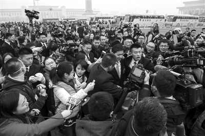 图为全国政协委员、百度公司CEO李彦宏在会议前遭到记者的“围追堵截”,他今年的提案重点关注三个话题:加快制定无人驾驶车法律法规;盘活专网闲置资源;完善我国空域资源管理制度,提升民航准点率。