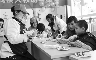 3月2日,在合肥市瑞园社区服务中心,志愿者(左一)将做好的蛋糕送给孩子。