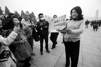3月4日,北京人民大会堂东门外广场,准备参加十二届全国人大四次会议预备会议的董明珠代表应媒体邀请,展示“拼搏‘十三五’,奋斗中国梦”的宣传板,以此为“十三五”加油鼓劲。董明珠是“十三五”规划专家委员会55位成员之一,作为企业家的她认为国家要大力发展实体经济,但作为实体经济企业不能光靠国家财政来支持,而需要创新来改变。本报记者 杨登峰 摄