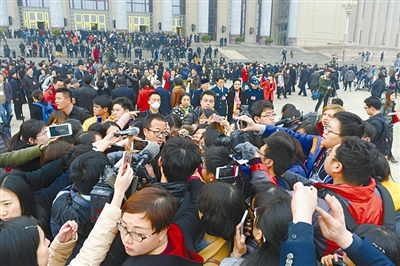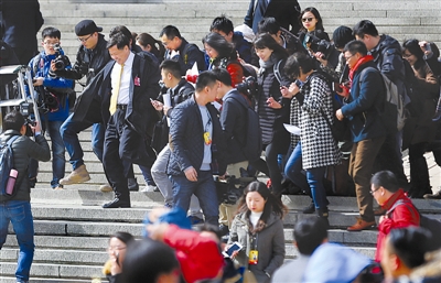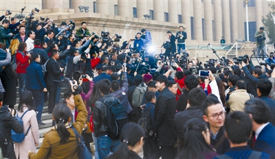 3月3日,全国政协十二届四次会议开幕式前,记者们在人民大会堂门口采访前来参加会议的委员。