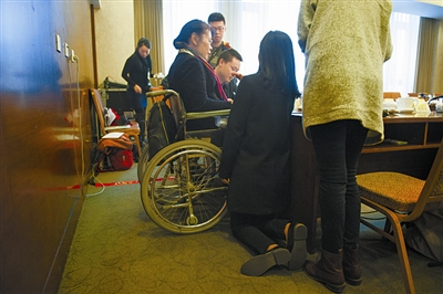 3月4日,福利保障界的小组讨论已经结束,一名记者跪在地上抢时间采访。