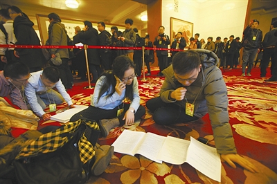 在人民大会堂里,拿到政府工作报告后,记者们第一时间抢发新闻。