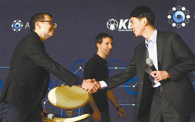 3月9日,李世石(右)与“阿尔法围棋”创始人德米什·哈萨比斯(左)在赛后新闻发布会上握手。当日,在韩国首尔举行的围棋人机大战首场比赛中,人工智能“阿尔法围棋”战胜韩国九段棋手李世石。 新华社记者 姚琪琳 摄