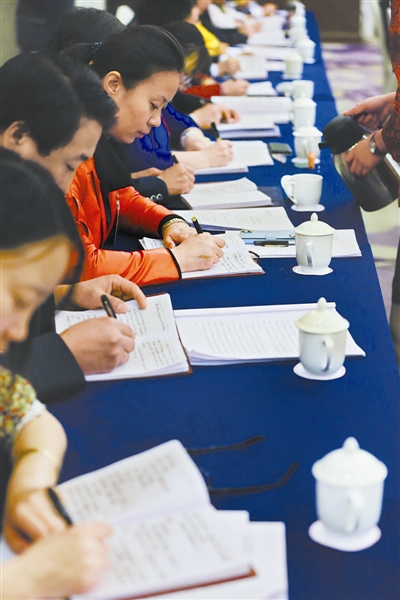 3月10日,在全国两会甘肃代表团审议全国人大常委会工作报告的全体会议现场,坐在后排的13位代表一边仔细听其他代表发言,一边认真做着记录。连日来,人大代表认真审议报告,切实关注民生。本报记者 杨登峰 摄