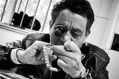 右眼上戴着一个放大镜头,黝黑而粗糙的手指拿着小镊子,精巧地游走在各种钟表零件中,桌上,手表电池、线路板、小零件等散乱地放在胳膊肘下方。