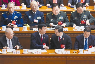 “两高”报告后的握手致意。本报记者 杨登峰 摄
