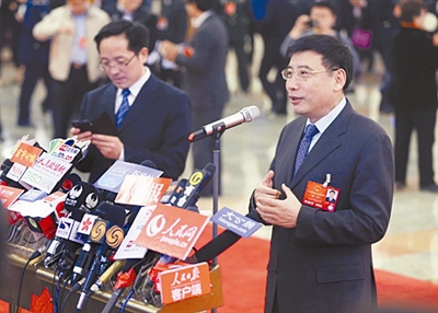 国家税务总局局长王军在“部长通道”接受媒体采访。