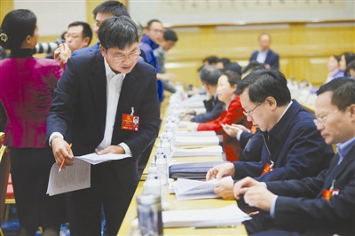 3月13日下午,在全国两会湖南代表团全体会议前,胡建文代表看到刚刚印发的慈善法草案修改稿中他们的建议被采纳了,兴冲冲地把这个消息告诉给身边的代表。
