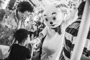 儿童节,它是一辆卡通主题车:车内贴着不同的卡通漫画和悬挂着各种小玩偶——喜洋洋与灰太狼、熊大等等。为了让孩子们学习简单的交规,上车处的一个篮子里,放着专供少年儿童学习的交规手册和相应的小奖品,孩子们可随手领取。
