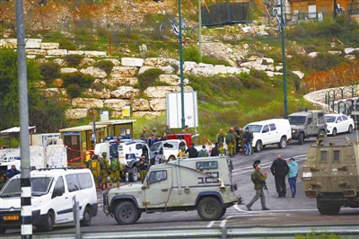 3月14日,在约旦河西岸南部城市希伯伦附近,以色列安全部队在袭击现场警戒。