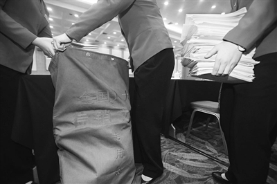 3月15日下午,湖南代表团全体会议结束后,工作人员将会上发放的材料统一回收。据工作人员介绍,材料会后统一回收进行处理,以节能环保的标准循环使用。本报记者 杨登峰 摄
