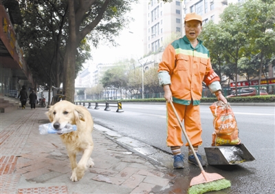 进入春天,气温回暖, 3月14日,四川成都玉沙路上,一名环卫柴大姐躬背扫起垃圾,身后,一只金毛狗寸步不离地跟上。一旦瞧见矿泉水瓶,金毛就扑过去,叼起瓶子后,跑回环卫工身边。