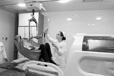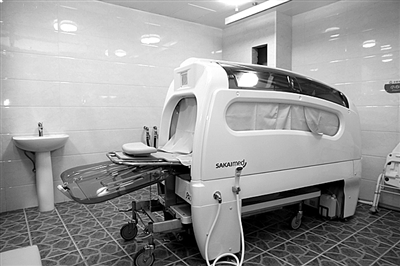 考虑到老人的医疗、康复和护理的特殊性,北京老年医院引进了全自动洗澡机,长期卧床、日常生活不能自理的老年患者由天轨移位系统传送至洗澡机内,喷漱、水按摩,洗涤、吹干等一系列功能使老年患者之前只能擦试身体,无法得到完全清理的情况得到改善。杨颖娜 摄