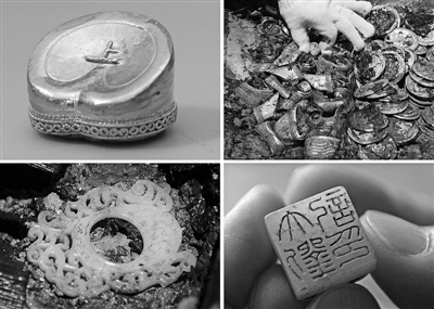 左上图为:海昏侯墓出土的马蹄金;右上图为:海昏侯墓主棺出土的金饼、马蹄金、麟趾金和金板;左下图为:海昏侯墓出土的龙虎形玉佩;右下图为:海昏侯墓出土的刻有“大刘记印”字样的龟形玉印。新华社记者 万象 摄