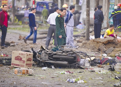 3月19日,在越南首都河内的河东郡,工作人员在爆炸现场勘查。