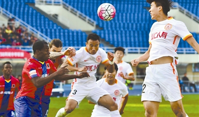 3月20日,在北京国家奥体中心举行的中甲联赛第2轮比赛中,北京北控队主场以1比0战胜北京人和队。图为双方球员激烈拼抢。本报记者 许之丰 摄