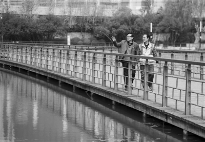 3月22日,武汉月湖的“民间湖长”文昌植(右)与志愿者在岸边巡湖。