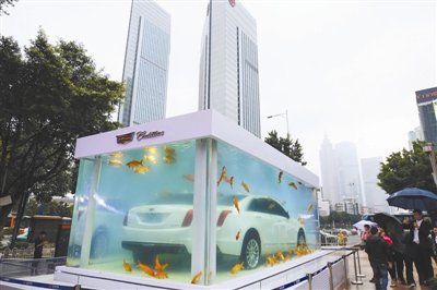 3月21日,广州市天河区,一品牌豪车将一完整的车体泡于金鱼缸中,声称自家油漆品质极高,对鱼无害,且车身气密性极高。上个月在上海展示两周后,这条“美人鱼”在近期前往广州。整个装置中除了CT6和近百条锦鲤,还要加入近70吨水,这无疑对场地承重提出了挑战,其次,装置体型庞大,其整体成型难度高。