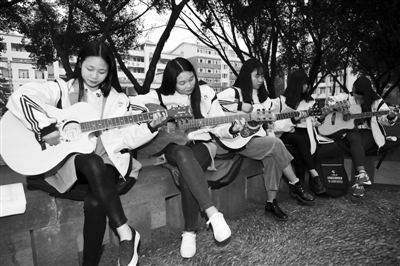 3月15日,在四川省广安市广安区思源中学校园内,音乐兴趣小组的留守学生正利用课余时间一起练习弹吉他,以抱团学本领的方式告别孤单。
