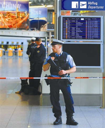 当日,比利时布鲁塞尔发生爆炸袭击事件。德国警察在法兰克福机场疏散旅客,暂时封锁机场部分区域,检查可疑物品。 新华社记者 罗欢欢 摄
