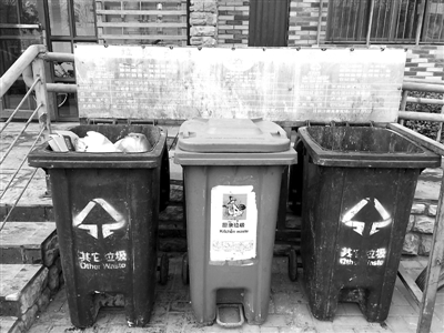 12年前,北京某小区设置了这样的组合垃圾分类箱,后面的提示板上详细写有垃圾分类介绍、清运人员的名字和电话。12年后,提示板上白色的字迹虽然已经变模糊了,但它们却可以清楚地证明:至少在这个小区,垃圾分类的初衷没有实现。本报记者 黄哲雯 摄